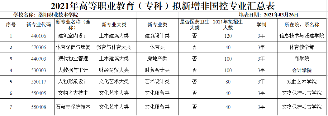 根据教育部《普通高等学校高等职业教育(专科)专业设置管理办法》《国家职业教育改革实施方案》、《中国教育现代化2035》、《职业教育提质培优行动计划(2020—2023年)》等文件精神,对接洛阳市“755”现代产业体系,洛阳职业技术学院按照专业设置程序,对2021年院属各教学单位申报的10个专业认真开展了市场调研、人才需求分析预测,经论证,2021年我院拟增设建筑室内设计、体育保健与康复、现代物业管理、大数据与审计、人物形象设计、文物考古技术及石窟寺保护技术7个高职专业。现予以公示,公示期三天。公示期内如有异议,请在公示期工作时间内与教务处联系。