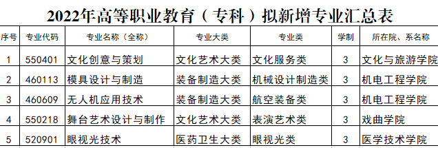 根据教育部《关于做好2022年职业教育拟招生专业设置管理工作的通知》(教职成司函[2021]41号)、《普通高等学校高等职业教育(专科)专业设置管理办法》等文件精神,洛阳职业技术学院按照专业设置程序,对2022年院属各教学单位申报的6个专业认真开展了市场调研、人才需求分析,经论证,2022年我院拟增设文化创意与策划、模具设计与制造、无人机应用技术、舞台艺术设计与制作、眼视光技术5个高职专业。现予以公示,公示期三天,公示期内如有异议,请在公示期工作时间内与教务处联系。