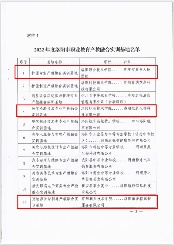 近日,由洛阳市教育局和洛阳市发展和改革委员会组织的“2022年度洛阳市职业教育产教融合实训基地项目”评审获批名单出炉,我校与洛阳市第三人民医院申报的护理专业产教融合实训基地等4个基地获批为“2022年度洛阳市职业教育产教融合实训基地培育单位”。