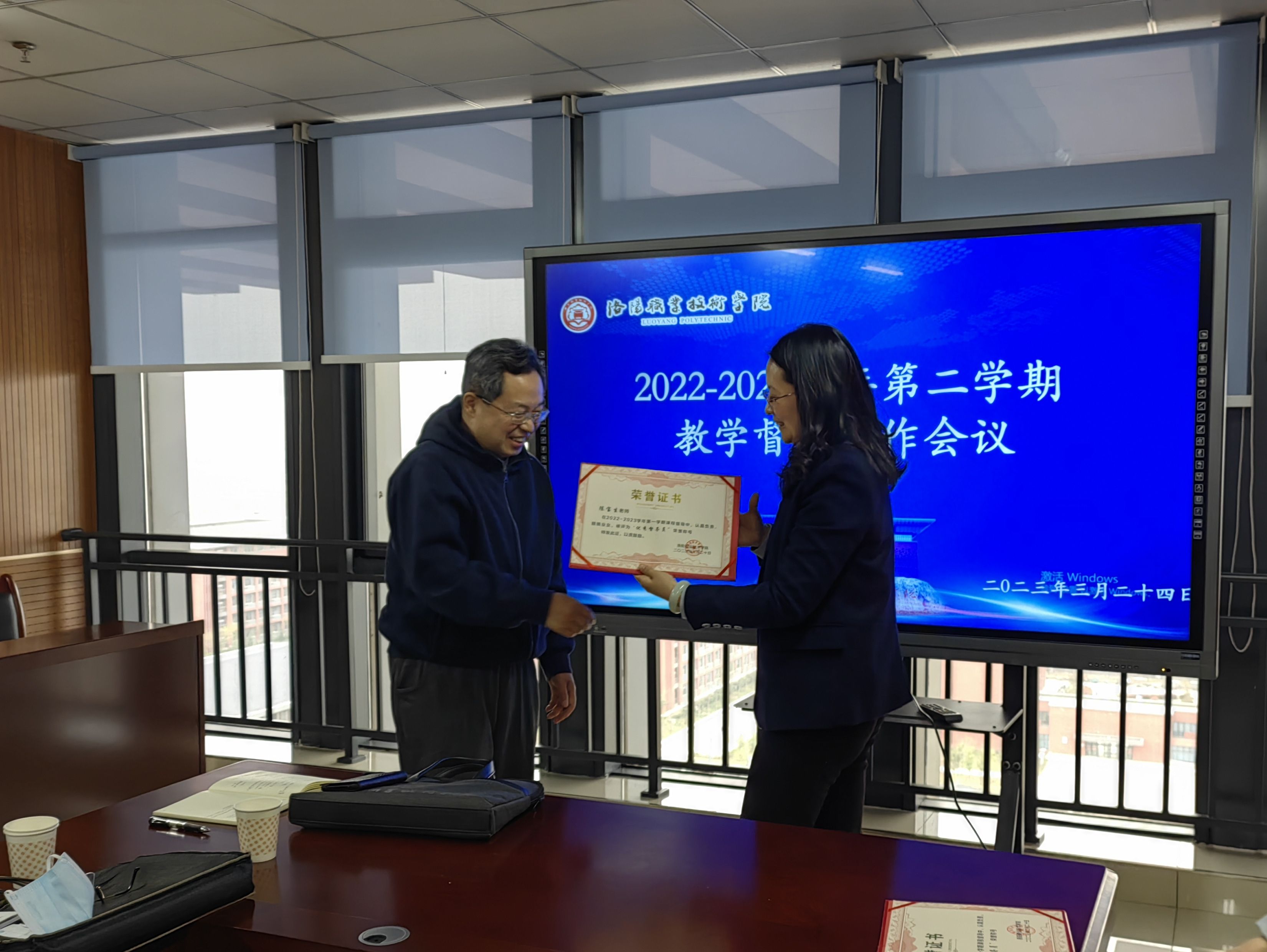 刘晨艳对第一学期督导工作进行了梳理,充分肯定了学校督导工作,并颁发2022-2023学年第一学期优秀督导员荣誉证书,对督导员的辛勤付出表示感谢。针对新学期督导工作的开展提出了具体要求:一是充分认识教学督导工作的重要性;二是要对青年教师及其校企合作教师进行全覆盖高标准督导;三是要求课程中心对督导组反馈的问题要及时解决,做好服务工作,保障教学督导工作高效开展。