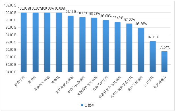 本学期前四周督导组采用抽查形式,全院学生平均出勤率为97.45%,护理学院、医学院、医学技术学院、商学院出勤率分别为100%。
