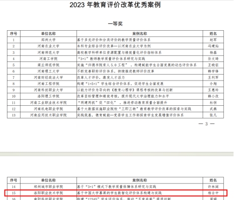 近日,我校分别在《2023年河南省职业教育优质教材认定》、《河南省2023年教育评价改革优秀案例征集》、《2023年河南省职业教育一流核心课程(线下)》申报工作中荣获多项省级教学荣誉。