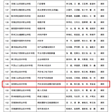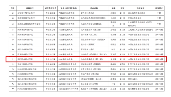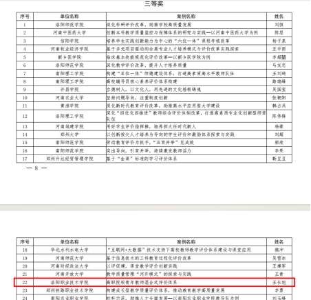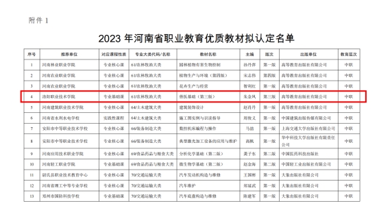 根据省教育厅公布结果,我校教师朱金凤在《2023年河南省职业教育优质教材认定》工作中入选中职材料一部,高职教材一部;在《河南省2023年教育评价改革优秀案例征集》工作中我校教师杨全中荣获一等奖1项,王长旭获三等奖1项;在《2023年河南省职业教育一流核心课程(线下)》工作中获批四项河南省一流核心课程。