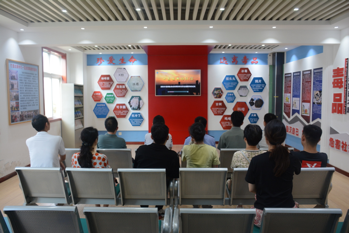 在强制戒毒所工作人员的引导下,党员们首先观看了禁毒宣传展,直观地认识各类毒品的形态。接着观看了视频《毒白》,戒毒人员讲述吸毒的危害,从他人的惨痛教训中深刻感受到吸毒的可怕后果。最后,党员们共同进行禁毒宣誓,在激昂的誓言中,同志们更加深刻地认识到珍爱生命,远离毒品以及禁毒工作的重大重要性。