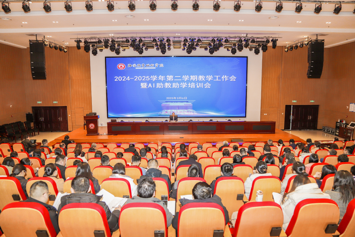 2025年3月6日,我校于大学生活动中心召开2024-2025学年第二学期教学工作会暨AI助教助学培训会。会议由课程中心主任刘晨艳主持,校长李保安、课程中心全体成员以及各教学单位教学副院长(副主任)、教学科研办主任、教研室主任出席。